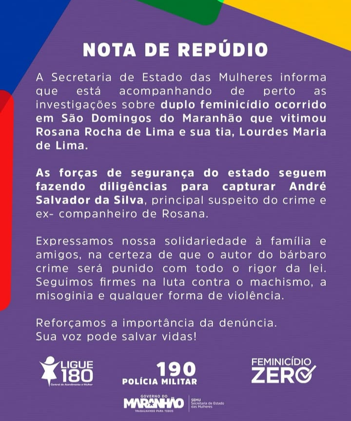 Em nota, a Secretaria de Estado das Mulheres repudiou o crime bárbaro e destacou que as forças de segurança seguem em busca do criminoso. Veja a seguir.